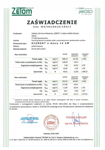 - certyfikat 5 klasy czystości spalin