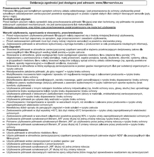 Do ochrony dróg oddechowych użytkownika przed szkodliwym oddziaływaniem zanieczyszczeń powietrza występujących w postaci cząstek stałych i/lub ciekłych tworzących aerozole (pyły, dymy, mgły) do 30 x NDS.