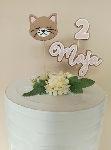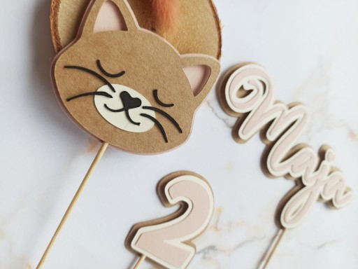 Ostateczne wymiary topperów z imieniem i cyferką zależą od wybranej treści. Głowa kotka ma ok. 5 cm wysokości (bez patyczka).