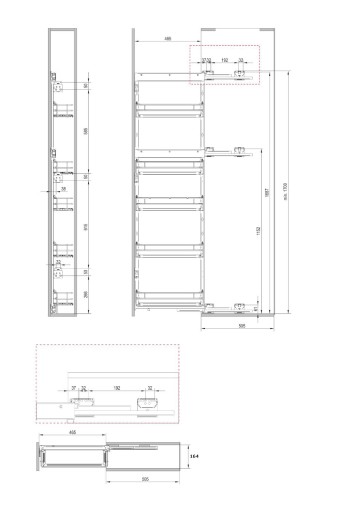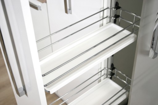 Kompletny zestaw składa się ze stelaża, prowadnic i 5 półek w kolorze chrom z tackami w kolorze białym.