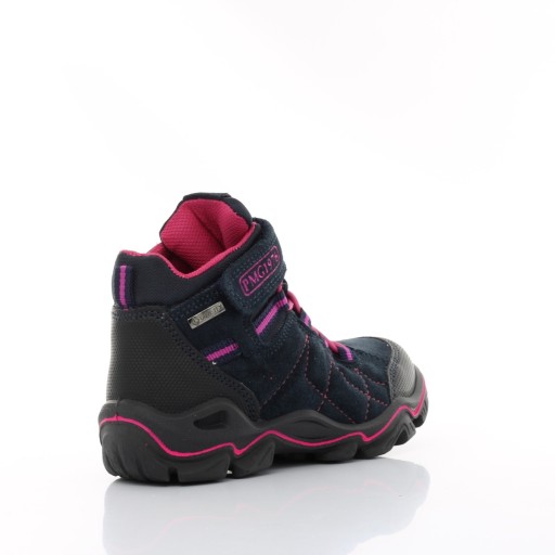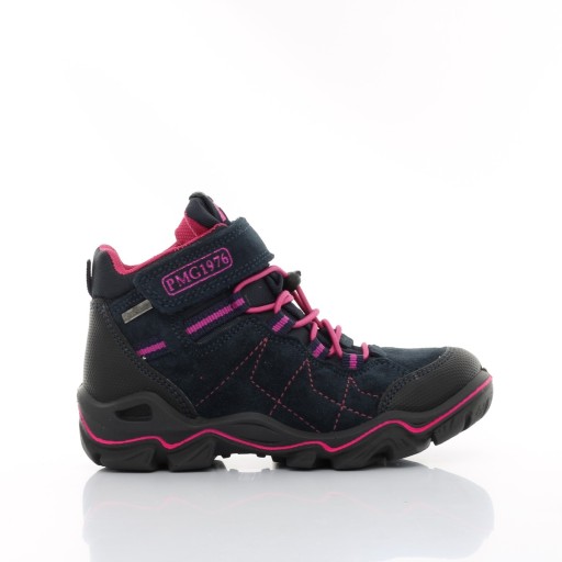 Obuwie typu sneakers w kolorze granatowo/różowym, wyprodukowane z najwyższej jakości skóry naturalnej oraz materiałów technicznych z membraną GORE-TEX nieprzemakalną, wiatroszczelną i oddychającą. Buty odpowiednio stabilne i elastyczne, wnętrze wyścielone miękkim materiałem, co chroni stopę przed otarciem. Usztywniony zapiętek oraz odpowiednia wysokość cholewki zapewnia stabilność. Wkładka profilowana - odpowiednio kształtuje prawidłowy rozwój stopy. Zapięcie regulowane rzepem oraz gumowaną sznurówką. Podeszwa elastyczna oraz antypoślizgowa.
