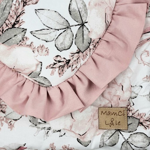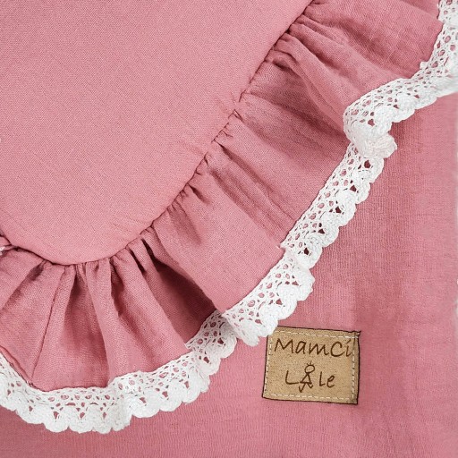 Wyłożone piękną, ręcznie wykonaną bawełnianą/muślinową pościelą. Kołderka dopieszczona jest chwostem, natomiast poduszka wykończona delikatną falbanką. Zestaw zawiera również materacyk. Doskonale sprawdzi się jako zabawka dla dziewczynek w wieku 2+.