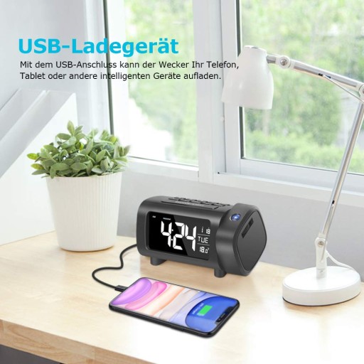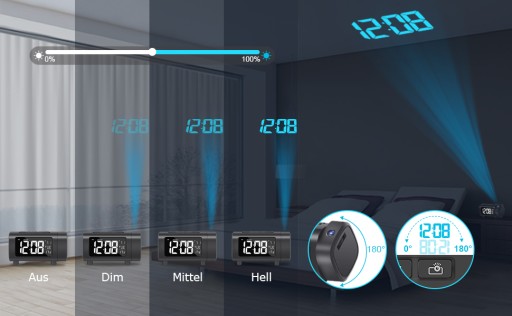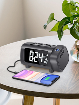 - Duży ekran VA; projektor 180° - W porównaniu do ekranu LCD i LED, ekran VA może zmniejszyć zawroty głowy w celu ochrony oczu. Budzik projekcyjny może pokazywać bardzo wyraźny czas w kącie ustawienia 180°, w odległości 0-0,5 m od ściany lub sufitu. Jest lekki i łatwy do zobaczenia czasu, szczególnie w nocy.