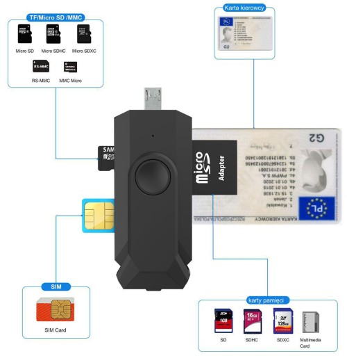 Dodatkowo odczyt z kart pamięci - TF/micro SD / MMC, SD, SDHC, SDXC, Multimedia oraz z kart SIM