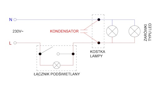 Eliminator rozbłysków należy podłączyć równolegle (II) do kostki przyłączeniowej lampy ze świetlówkami energooszczędnymi lub oświetleniem LED ~230V.