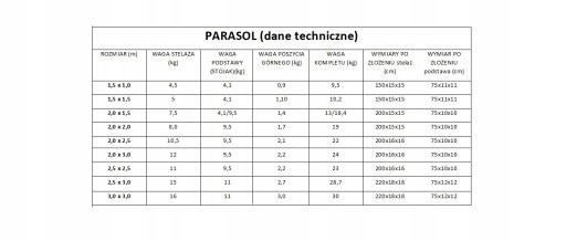 Produkujemy parasole o innych wymiarach podanych w tabeli poniżej (dostępne na innych aukcjach).