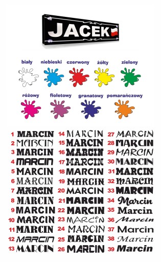 Na poniższych grafikach znajdziesz loga i czcionki do wyboru jak również wszystkie możliwe kolory, których możemy użyć na tablicy.