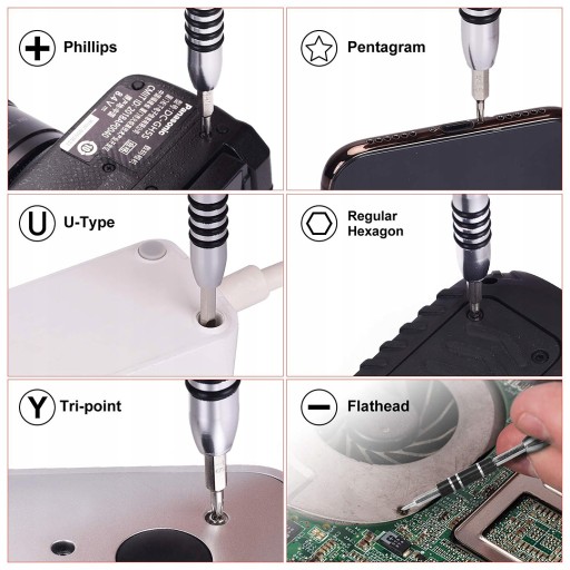 Zestaw 110 precyzyjnych narzędzi, bitów i otwieraków z lekkim aluminiowym uchwytem przeznaczony do precyzyjnych napraw serwisowych telefonów i smartfonów w tym produktów marki Apple oraz wszelkiej elektroniki konsumenckiej.