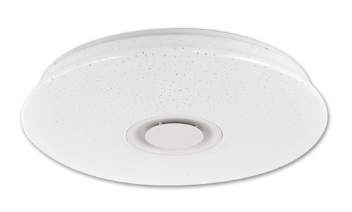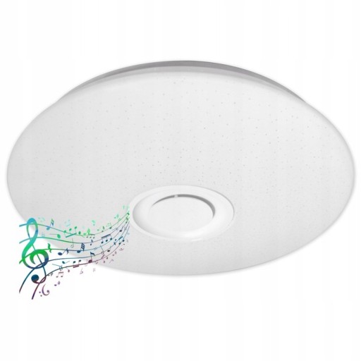 Nowoczesny PLAFON LED o średnicy 50cm x 7,5cm z wbudowanym głośnikiem BLUETOOTH który działa w technologii opartej na Bluetooth 4.0 + EDR (zwiększona szybkość transmisji danych) dzięki któremu możemy odtwarzać muzykę z telefonu lub komputera. Plafon wyposażony jest w diody które świecą światłem białym w pełnym spektrum CCT, a jest to Temperatura barwowa która określa kolor białej diody LED. CCT jest zdefiniowany w stopniach Kelvina; ciepłe światło wynosi około 2700 K, przechodząc do neutralnej bieli przy około 4000 K i do zimnej bieli przy 5000 K lub więcej, dodatkowo każdą wybraną barwę CCT możemy ściemniać i rozjaśniać.
