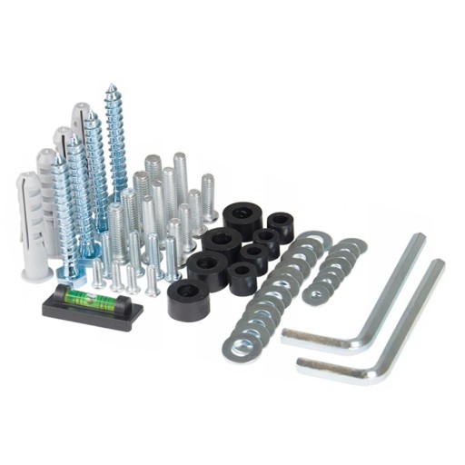 - W zestawie uniwersalny komplet śrub montażowych do telewizora oraz komplet wkrętów i kołków do ściany,