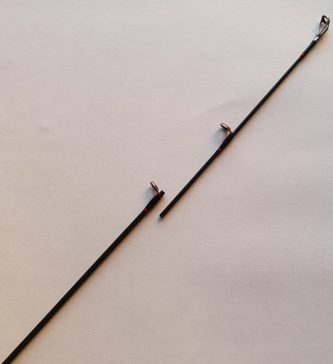 Wędka używana, górna część jest złamana przy końcu, uszkodzenie widoczne na zdjęciu.