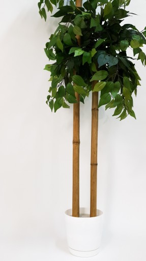 Fikus umieszczony w białej doniczce. Świetnie nada się jako ozdoba do domu lub biura. Wykonany w sposób by jak najlepiej imitować prawdziwą roślinę.