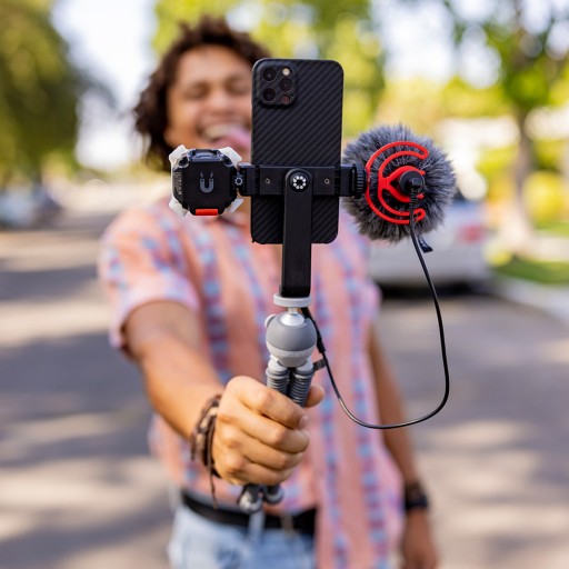 Zestaw Podzilla Medium Kit oprócz statywu zawiera także klamrę na telefon – Joby GripTight 360°. Jej główna zaleta to możliwość szybkiej zmiany pozycji z poziomej na pionową. Pozwala także zamocować aż dwa dodatkowe akcesoria we wsuwane gniazda zimnej stopki (np. zewnętrzny mikrofon, lampka LED).
