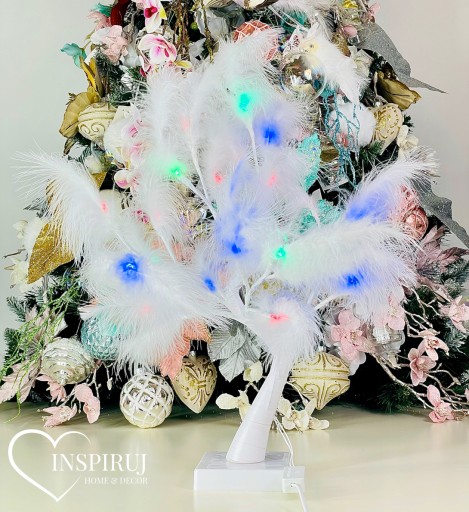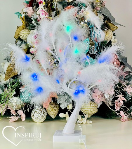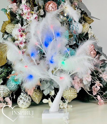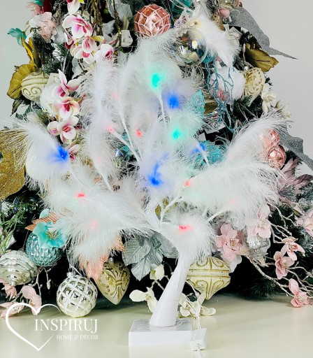 4️⃣ Kolor: Drzewko i pióra białe a lampki są w kolorze multicolor - kolorowym.