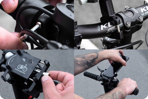 Aluminiowa obręcz, ktorą montujemy uchwyt do kierownicy podklejona jest antypoślizgowymi paskami, a dokręcana jest dwoma śrubami (klucz w zestawie). Pozwala to na naprawdę solidne zamocowanie uchwytu, bez obaw, że uchwyt się przekręci lub opadnie.