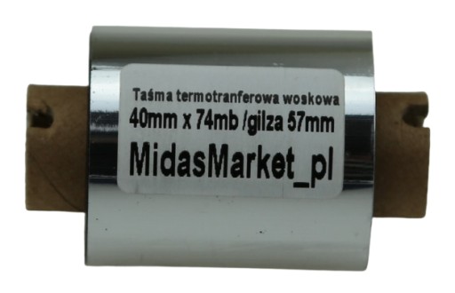 Czarna taśma TTR (Thermal Transfer Ribbon)/kalka/folia termotransferowa WOSKOWA o szerokości 40mm i długości 74mb nawinięta na gilzę/rolkę o średnicy 1/2" (13mm) i długości 57mm.