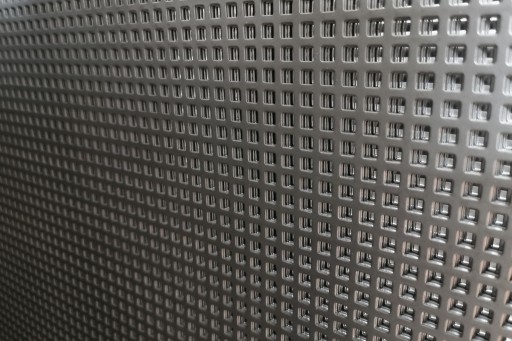 Blacha perforowana ocynkowana (ocynk ogniowy srebrny) z oczkami kwadratowymi w układzie prostym.