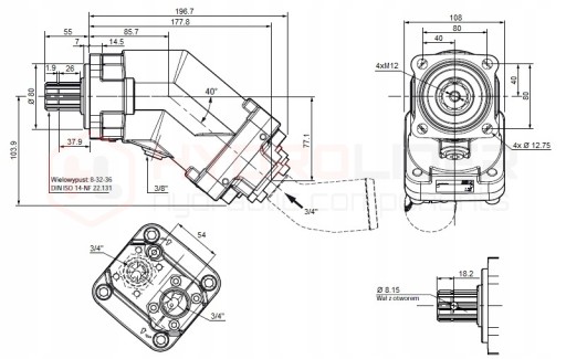 Konstrukcja 7-tłoczkowa, nachylenie osi tłoczków względem osi wałka 40°. Zwarta i kompaktowa budowa, przednie łożysko stanowi jednocześnie centrowanie pompy. Mocowanie przystawkowe kołnierz ISO mocowany na 4 śruby, rozstaw 80x80mm; zamek centr. 80mm,wał wielowypust 8-32-36, porty olejowe tylne, króciec ssący w 45° w komplecie.