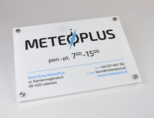 Tabliczka firmowa wykonana jest innowacyjną metodą druku UV na wysokiej jakości plexi mlecznej o grubości 4 mm. Tabliczka posiada otwory i zaopatrzona jest w cztery dystanse ułatwiające jej przymocowanie. Całość tworzy bardzo elegancką kompozycję.