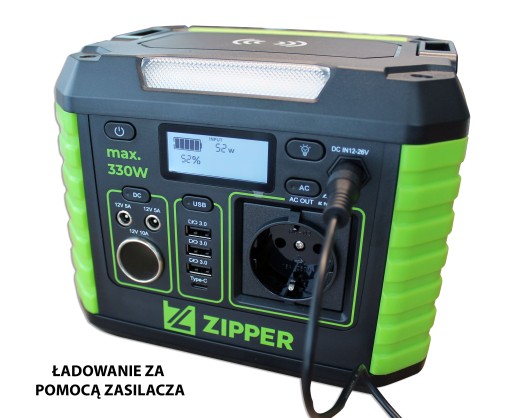Zipper ZI-PS330 to przenośna stacja zasilania do zasilania urządzeń nawet w przypadku braku dostępu do sieci elektrycznej. Ładowana jest przez panel słoneczny, zasilacz oraz zapalniczkę samochodową. Nadaje się do ładowania laptopa, smartfonu, GoPro itp.