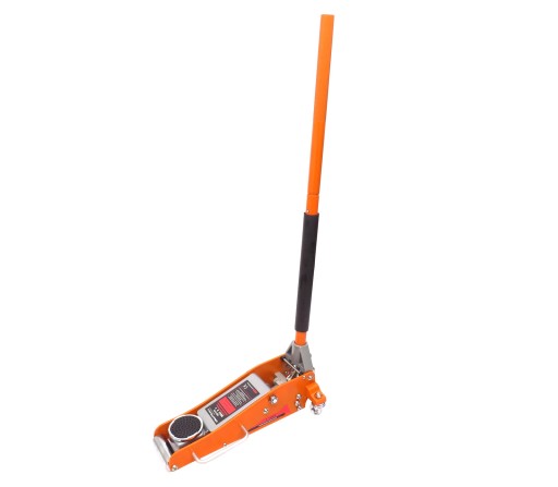 Podnośnik hydrauliczny niskoprofilowy o udźwigu 2T. Podnośnik wyposażony jest w łożyskowane koła skrętne osi tylnej.