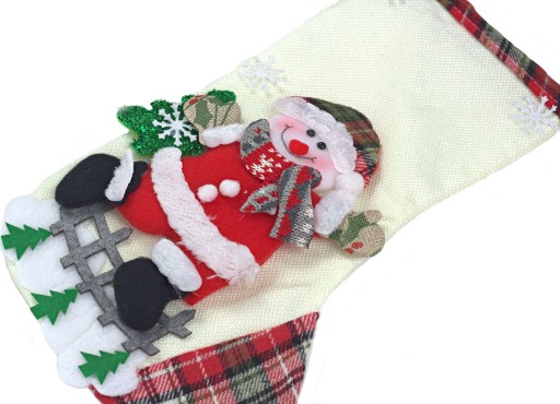 Dekoracyjna skarpeta świąteczna z aplikacją 3D. Jej średni rozmiar sprawi, że zmieszczą się w niej ciekawe prezenty - słodycze, drobne zabawki, różne drobiazgi i nie tylko. Piękne wykonanie i efektowny wygląd sprawi, że będzie piękną ozdobą świąteczną nie tylko na kominku, ale także na poręczach czy nawet na klamkach drzwi. Sprawdzi się jako opakowanie na prezenty zarówno dla dorosłych jak i dla dzieci.