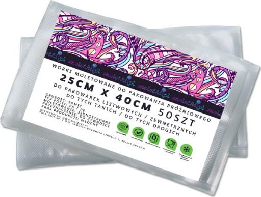 Worki moletowane do pakowania próżniowego żywności przy użyciu pakowarek listwowych – bezkomorowych. Umożliwiają szczelne zabezpieczanie pakowanej żywności, która izolowana od dostępu powietrza i wilgoci, dłużej zachowuje świeżość oraz wartości odżywcze. Opakowania współpracują z wszystkimi popularnymi na rynku modelami pakowarek. Odpowiednio dobrana struktura przetłoczeń ułatwia sprawne i szybkie odsysanie powietrza.