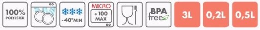 W zestawie oprócz pojemnej, półsztywnej, wodoodpornej torby znajdują się 4 pojemniki: dwa szczelnie zakręcane oraz dwa z elastyczną, otwieraną pokrywą. Pojemniki zostały wykonane z wysokiej jakości trwałego materiału, odpornego na uszkodzenia mechaniczne. Dodatkowo materiał ten jest całkowicie wolny od szkodliwego Bisfenolu. Ponadto z pojemników można korzystać także w zamrażarce czy mikrofali.