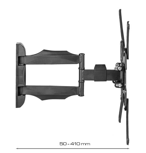Bardzo prosty w montażu, bardzo wytrzymała, solidna konstrukcja zapewnia użytkownikowi bezpieczne użytkowanie. Dostępny w kolorze czarnym. Maksymalny udźwig do 40 kg. Bardzo łatwy i bezpieczny montaż na ścianie. W komplecie zestaw śrub i kołków montażowych. Posiada możliwość regulacji pochylenia pod kątem +/- 10° oraz obrotu pod kątem od 0° do 160°. Dodatkowo możemy regulować płynnie odległość od ściany. Producent zastosował ruchome ramiona, które pozwalają na montaż praktycznie każdego telewizora o określonej przekątnej VESA max 400x400.
