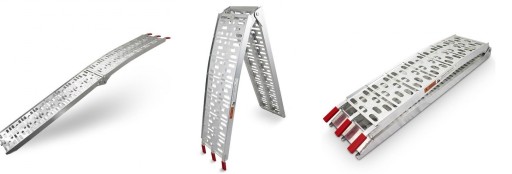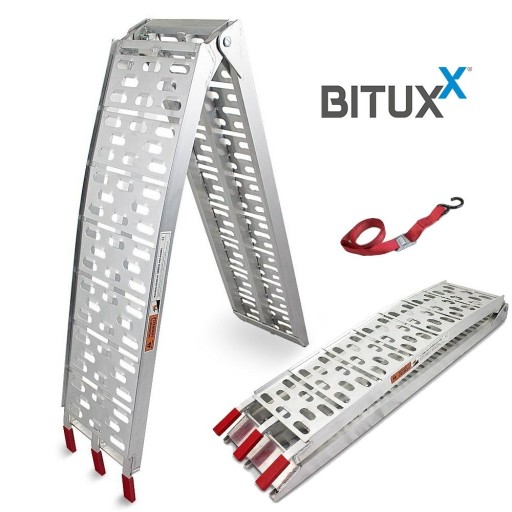 Aluminiowy podjazd o udźwigu 340kg. Bardzo solidny i łatwy w użyciu. Idealny do załadunku motocykli, kosiarek, skuterów, sprzętu budowlanego, itp. Bardzo solidny i łatwy w użyciu