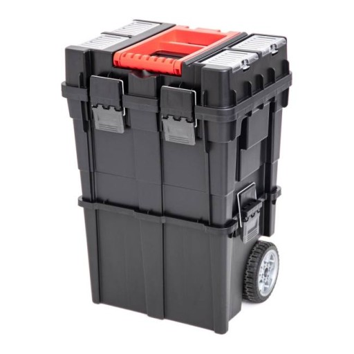 zapięcia z udarnego poliamidu, 4 organizery w pokrywie z poliwęglanowymi pokrywami, głęboka tacka, praktyczna rączka i możliwość transportu skrzynki na kółkach
