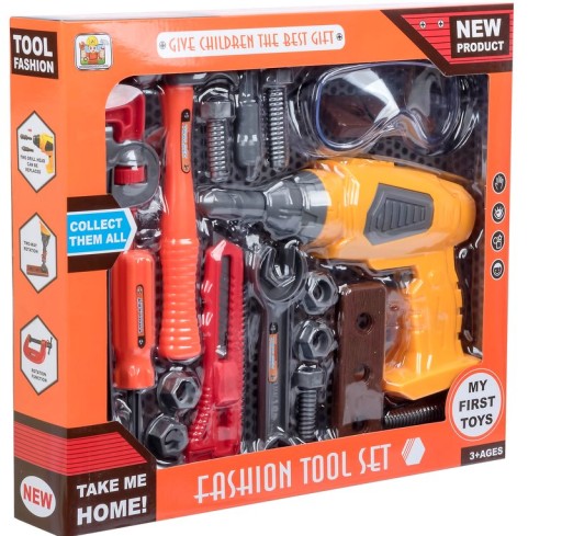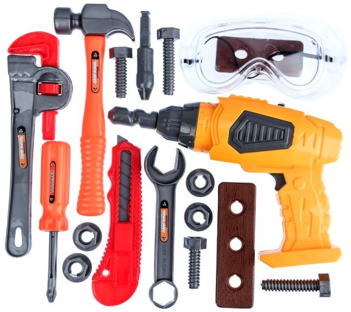 Zestaw zawiera: wiertarka, śruby, okulary, klucz francuski, młotek, śrubokręt, klucz płasko/oczkowy