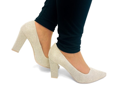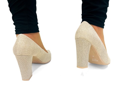 Złote brokatowe czółenka na wysokim, stabilnym obcasie