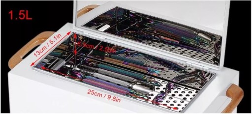 - Pojemność 1,5 l, która pozwala sterylizować małe przedmioty, takie jak metalowe pojemniki, narzędzia kosmetyczne, male tacki, sztućce, różne instrumenty medyczne do stomatologii, chirurgiczne i wiele więcej