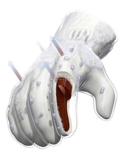 - Rozwiązanie Reusch: wysoce oddychające zimowe rękawice ułatwiają proces parowania, jednakże redukują straty cieplne możliwe w tym procesie.