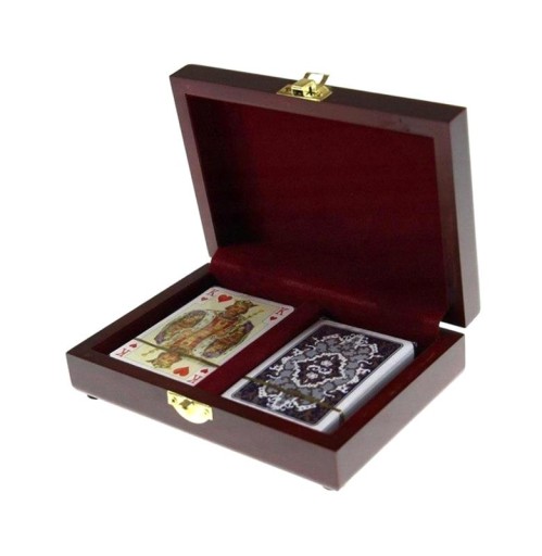 Ekskluzywny zestaw kart Piatnika w szkatułce z ciemnego drewna z z delikatnie widocznymi słojami, wyściełane bordowym, miękkim materiałem.