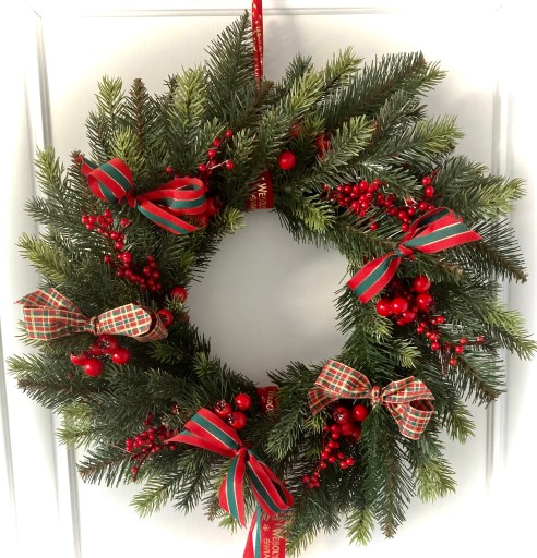 Każdy wianek przyozdobimy bardzo starannie wyjątkowymi dodatkami florystycznymi w czerwonej i zielonej kolorystyce oraz dobrej jakości kokardą.
