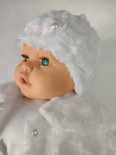 Płaszcz wykonany ze śnieżnobiałego FUTERKA, cały ocieplony, na podszewce. Krój z kołnierzykiem, zapinany na guziki w formie pięknych perełek
