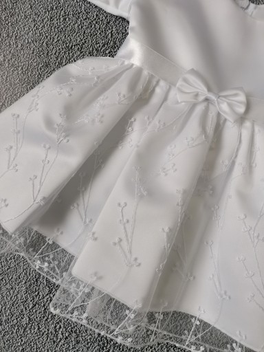 Sukienka delikatna z długim rękawem. Góra gładka, dół to 2 warstwy - satyna a na wierzchu pięknie haftowany tiul. Sukienka zapinana z tyłu na zamek błyskawiczny, dodatkowo w pasie regulowana za pomocą szarfy