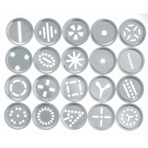 Perfekcyjne wypuszczanie ciasta bezpośrednio na blaszce do pieczenia: dokładne porcje ciasta dzięki możliwości regulacji. 20 perforowanych krążków z różnymi motywami wykonanymi z aluminium i 4 różne dysze z tworzywa ABS oferują nieograniczone możliwości gotowania i dekoracji.