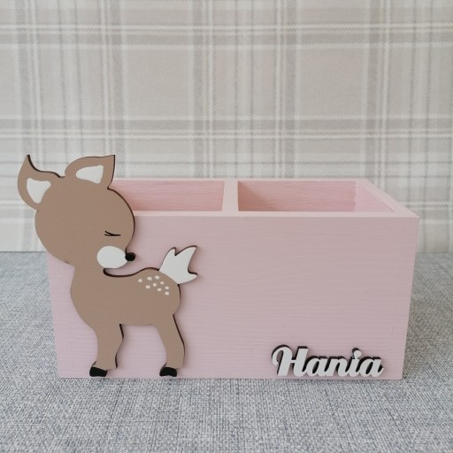 Przybornik został przez nas pomalowany na jasno różowy kolor a jego dodatkową ozdobą jest namalowany przez naszych plastyków dekor oraz imię dziecka, które należy podać przy składaniu zamówienia.