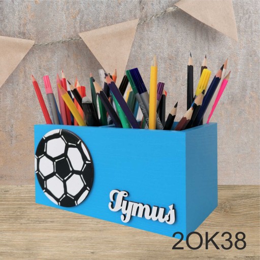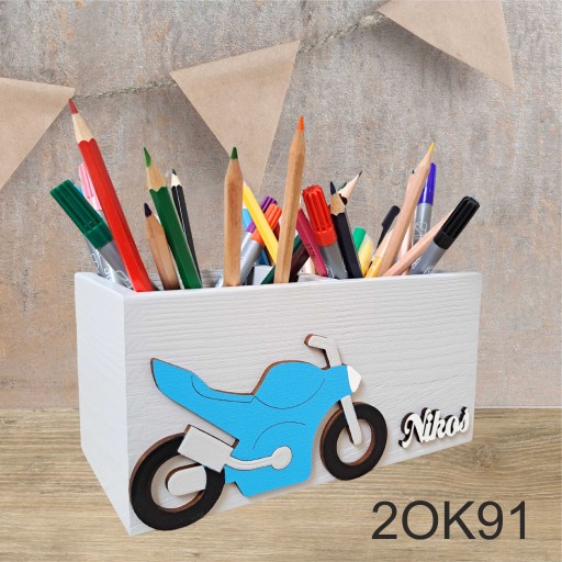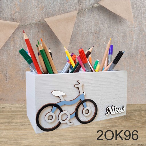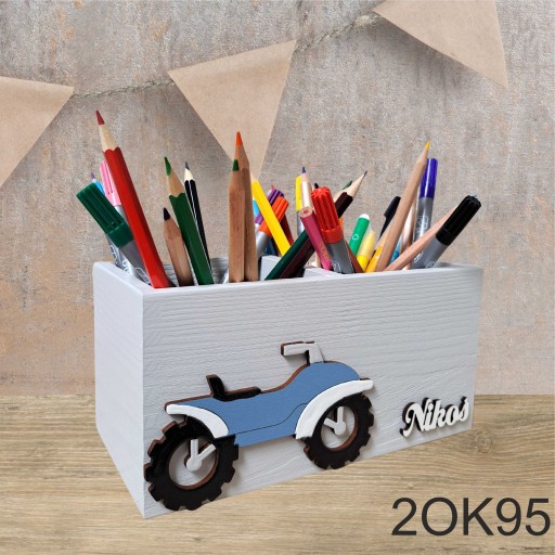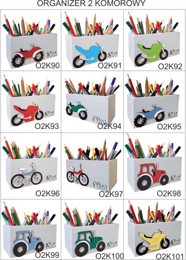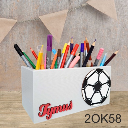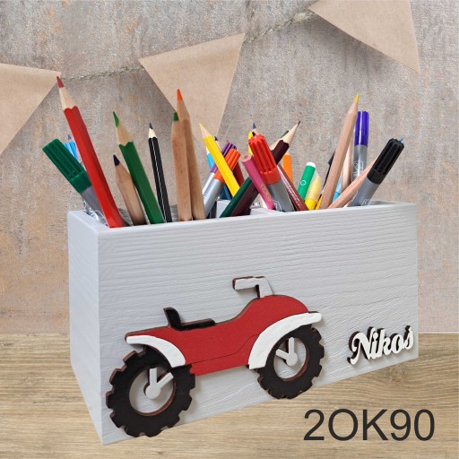 Przybornik został przez nas pomalowany na szary kolor a jego dodatkową ozdobą jest namalowany przez naszych plastyków dekor oraz imię dziecka, które należy podać przy składaniu zamówienia.