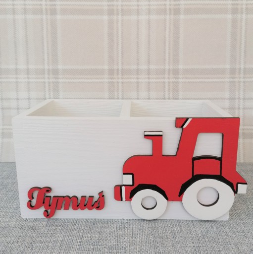 Przybornik został przez nas pomalowany na BIAŁY kolor a jego dodatkową ozdobą jest namalowany przez naszych plastyków dekor oraz imię dziecka, które należy podać przy składaniu zamówienia.