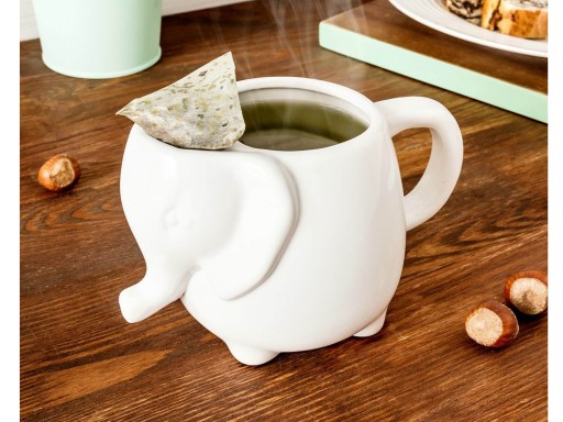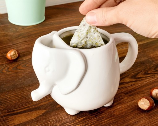 Piękny i wyjątkowy kubek słonik z kieszonką na torebkę herbaty, z którego kawa smakuje również inaczej niż zwykle ;) Kubek słusznej jak na słonia wielkości i pojemności aż 0,5 l, idealny na chłodne dni, by mógł ogrzać swym ciepłem Twoje dłonie.