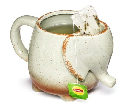 - z kieszonką na zużytą torebkę herbaty w głowie słonia