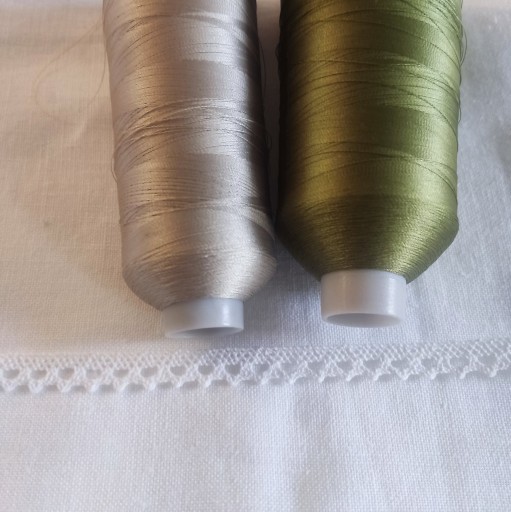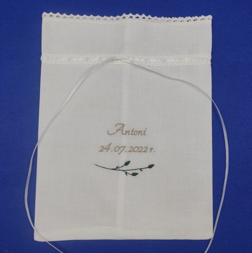 Standardowo woreczek haftowany jest w kolorach nici - beżowym, motyw gałązki - oliwkowym obszyty delikatną białą bawełnianą koronką.
