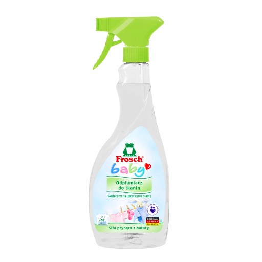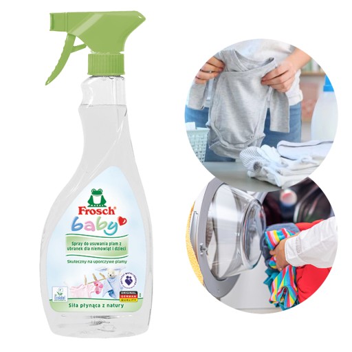 Frosch Baby Spray do usuwania plam z ubranek dla niemowląt i dzieci do usuwania zabrudzeń z ubrań dziecięcych i niemowlęcych. Dzięki naturalnym składnikom Frosch Baby radzi sobie nawet z zaschniętymi i starymi plamami na ubraniach.