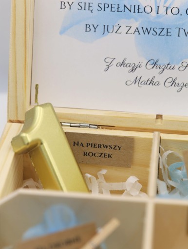 Piękny zestaw prezentowy na Chrzest, umieszczony w drewnianej skrzyni z przegródkami, w skład którego wchodzą elementy symbolizujące pierwsze momenty z życia dziecka.