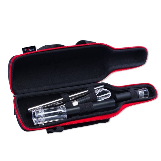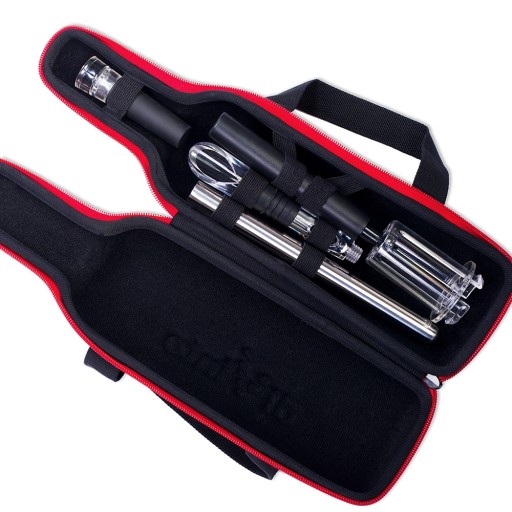 - skład zestawu: wykonane z twardego i solidnego materiału etui (Extreme Wine Bottle Case), chłodzący sopel do wina z nalewakiem, korkociąg ciśnieniowy, stoper z pompką