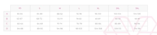 Tabela rozmiarów: A: Biust B: Pod biustem C: Talia D: Biodra